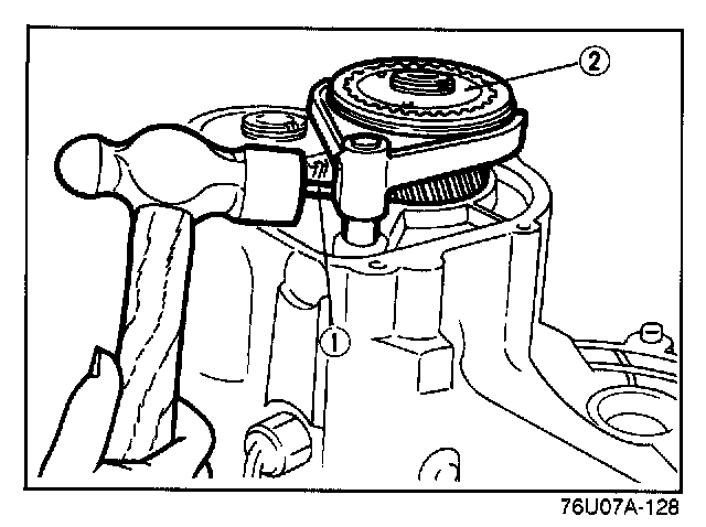 8. Align the shift fork and shift rod spring pin holes, tap in the spring pin (1), and install the stopper plate (2) on top of the clutch hub.