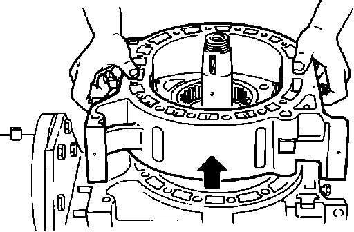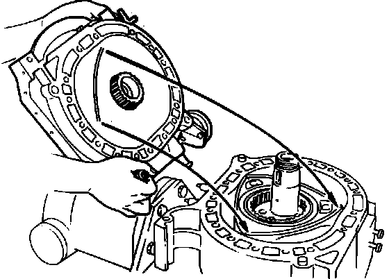 2. Lift the intermediate housing off the shaft, being careful not to damage the shaft. The intermediate housing should be removed by sliding it beyond the rear rotor journal on the eccentric shaft while holding the intermediate housing up and at the same time pushing up the eccentric shaft.