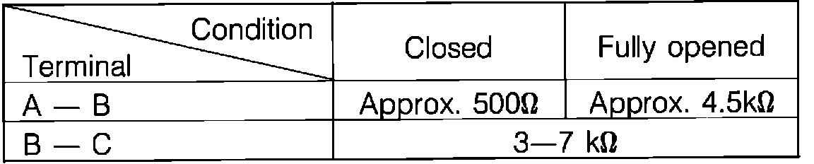 6. If voltage is incorrect at terminals other than D, check resistances of throttle sensor, terminals 2A, 2C, 2E and IG of EGI control unit and the wiring harness.