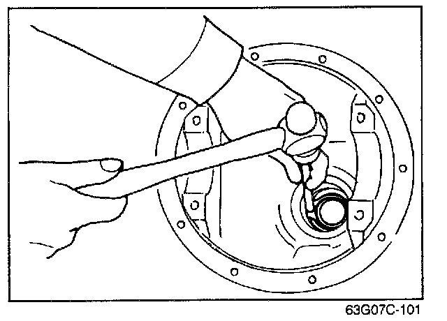 3. Push the drive pinion out by attaching a miscellaneous lock nut to the drive pinion, and tapping it with a copper hammer.