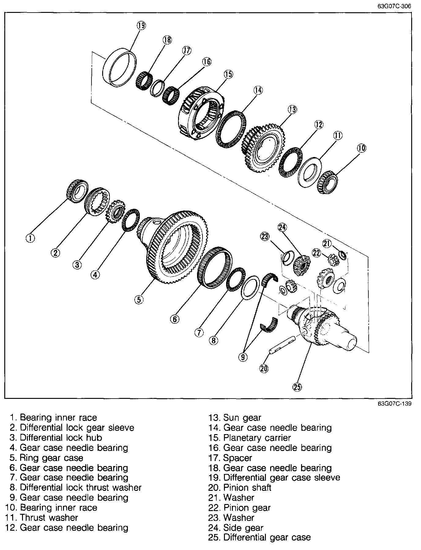 2. Remove the differential lock gear sleeve, differential lock hub and gear case needle bearing.