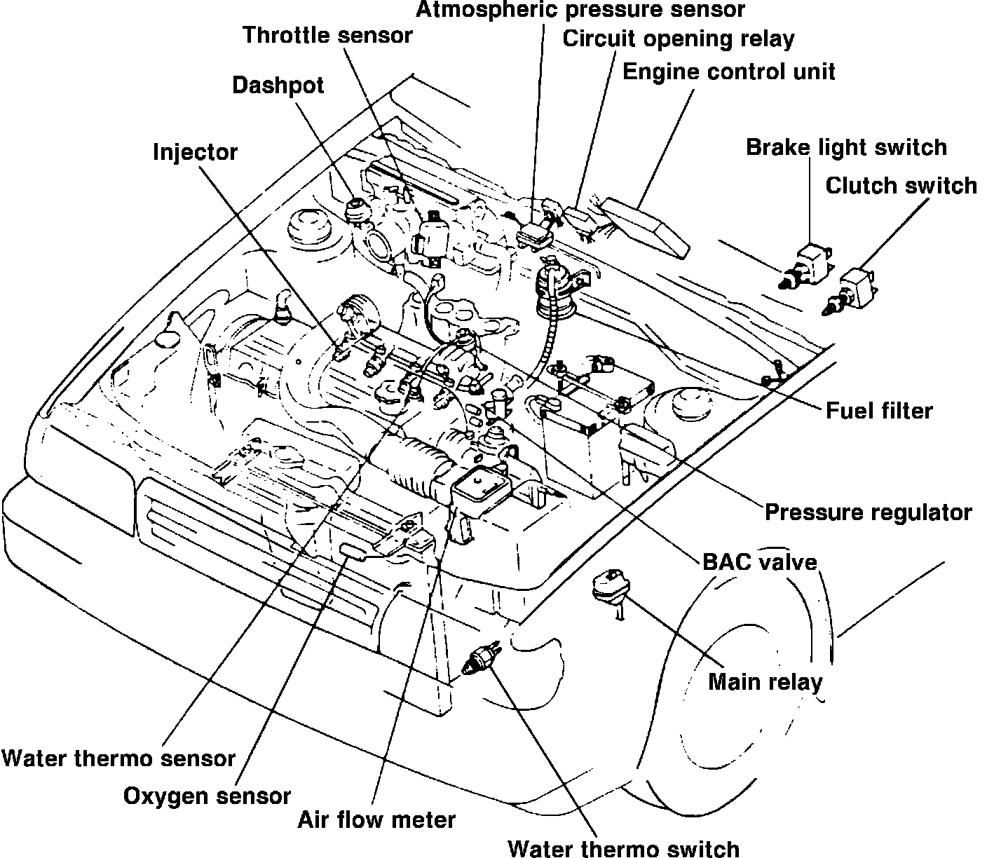 Fig. 13 Engine compartment reference diagram. Exc. Turbo: