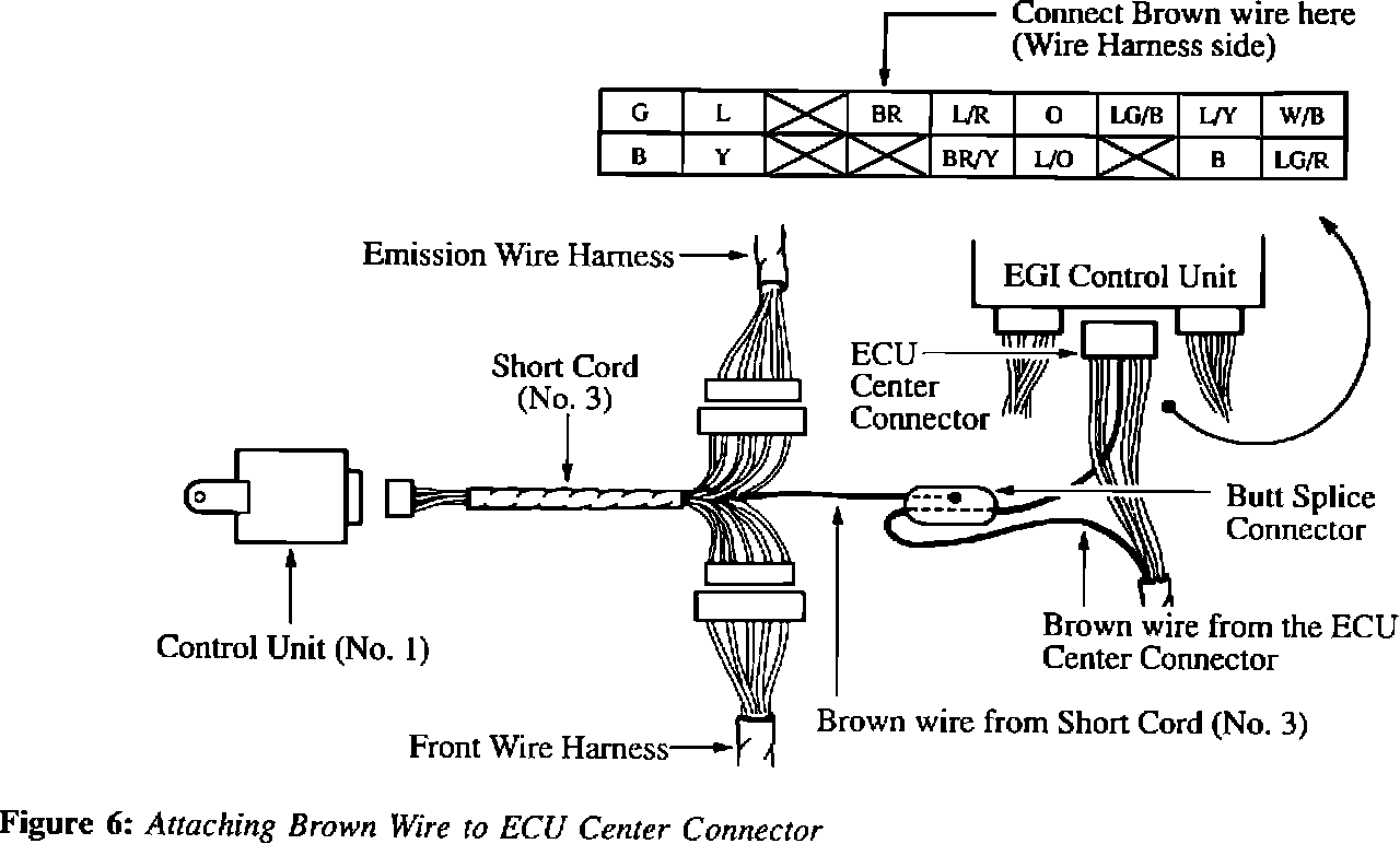 6) Install brown wire from short cord (No. 3), to brown wire from ECU center connector with a butt splice connector. Figure 6.