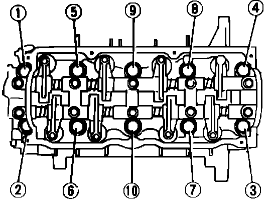 c. Place cylinder head in place, apply engine oil to bolt threads and seat faces and tighten cylinder head bolts to 59-64 ft.lb ( 80-86 Nm) in two or three steps in proper sequence, Fig. 18.