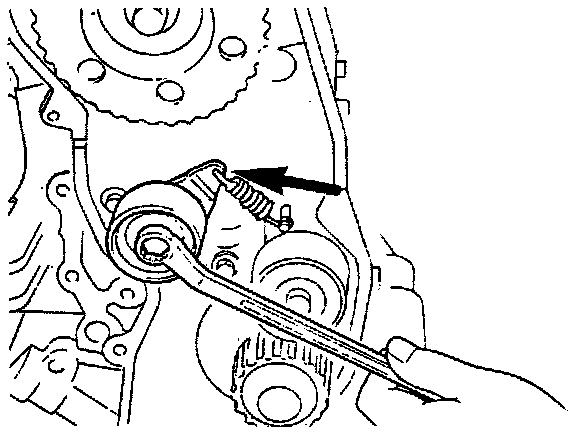c. Install the timing belt tensioner and spring. Temporarily secure it with the spring fully extended.