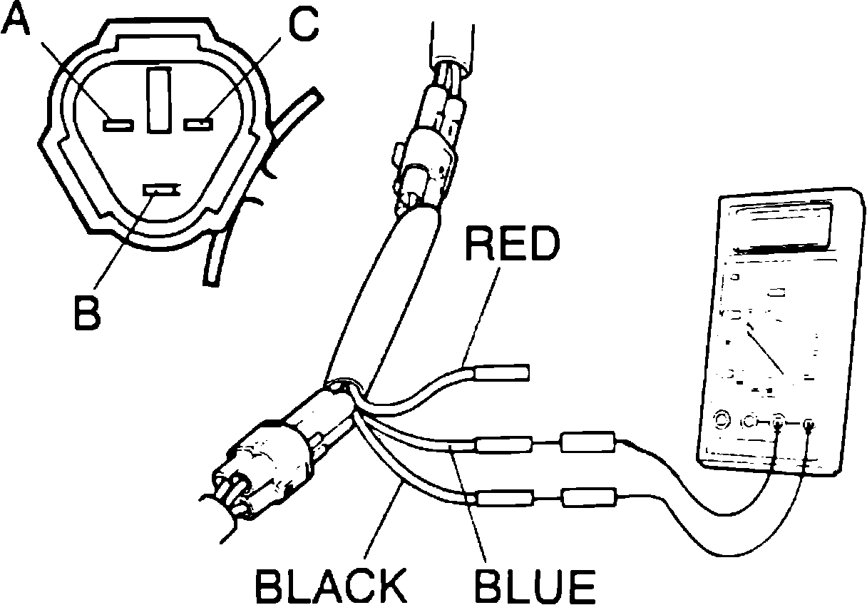 5. Check voltage of each terminal. Voltage at terminal A should be 4.5-5.5 volts and voltage at terminal B should be less than 1.5 volts. Voltage at terminal C should be approximately .7 volt with no vacuum applied and approximately 4.7 volts with 5.9 inches Hg vacuum applied.