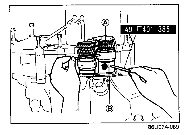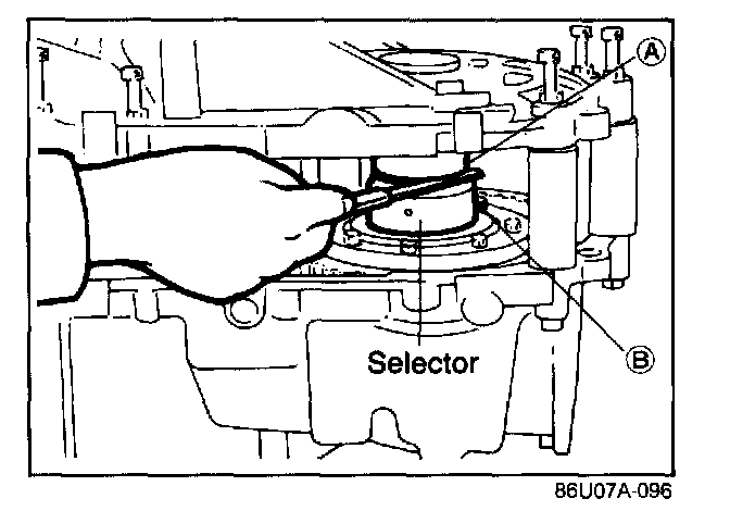6. To seat the bearings, mount the SST on parts (A) and (B) of the selector, and turn the selector so the gap shown by the arrow in the image is widened. Move the bar by hand until the selector can no longer be turned, then turn it in the reverse direction until the gap (arrow) is eliminated.