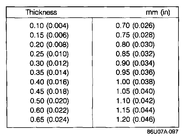 9. Select the shim for the shaft gear by referring to the table and selecting the shim which is nearest on the thin or thick side as shown to the value obtained when subtracting the thickness of the diaphragm spring which goes between the shim and the race, from the measurement of the gap in the SST.