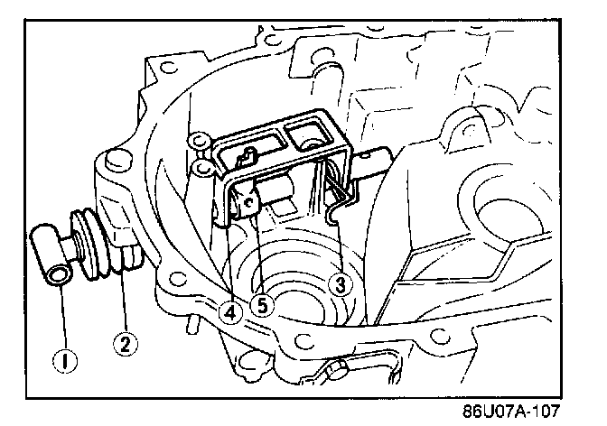 10. Install the change rod (1), the boot (2), the spring (3), the reverse gate (4), and selector (5), as shown.