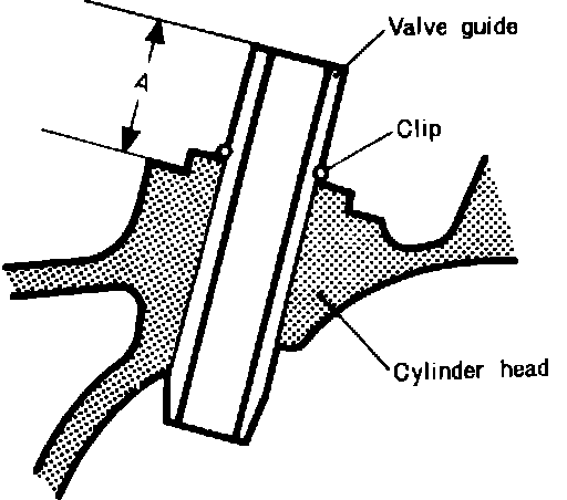 Measure clearance between valve stem and guide. If clearance exceeds .008 inch (.2 mm), replace valve guide. To replace valve guide, use tool No. 49 0221 251A and knock guide out from side opposite combustion chamber. Install clip onto new guide, then drive guide into cylinder head using removal tool. The clip must just contact cylinder head, .752-.772 inch (19.1-19.6 mm) from end of valve guide, Fig. 4.