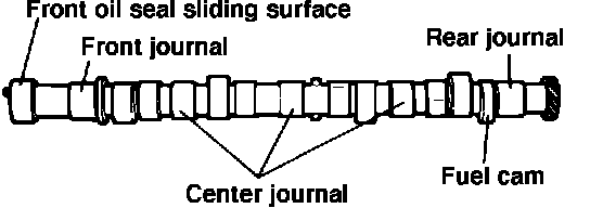 Check camshaft for wear or damage and replace as necessary. Measure cam height and journal diameter and replace the camshaft if not within specifications. Measure front oil seal sliding surface and fuel cam, Fig. 7. Oil seal sliding surface should measure 1.337-1.338 inch (33.961-34.000 mm) and fuel cam should measure no less than 1.4645 inch (37.2 mm). If measurements are not within specifications, replace camshaft. Ensure camshaft runout does no exceed .0012 inch (.03 mm) and camshaft endplay is not more than .008 inch (.20 mm).