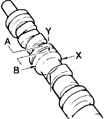 1. Place front and rear journals on V-blocks and check camshaft runout. If runout exceeds .0012 inch (.03 mm), replace camshaft.