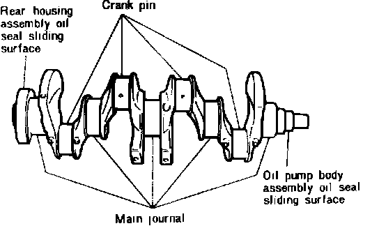 Check crankshaft for wear, damage or clogged oil passages. Replace crankshaft if runout exceeds .0012 inch (.03 mm). Compare crankshaft measurement, Fig. 11, to the following specifications. On all models, main journal diameter, 2.3597-2.3605 inches (59.937-59.955 mm); crank pin diameter, 2.0055-2.0061 inches (50.940-50.955 mm). On 1984-86 models, rear housing assembly oil seal sliding surface, 3.5412-3.5434 inches (89.946-90.000 mm); oil pump body assembly oil seal sliding surface, 1.3371-1.3386 inch (33.961-34.000 mm). Measure uneven wear on journal and pin at four indicated positions, Fig. 12. Wear should not exceed .002 inch (.05 mm). If wear exceeds limits, the crankshaft may be ground to a maximum of .0295 inch (.75 mm) and an undersize bearing installed. Undersize bearings are available in the following sizes: .010 inch (.25 mm), .020 inch (.50 mm) and .030 inch (.75 mm).