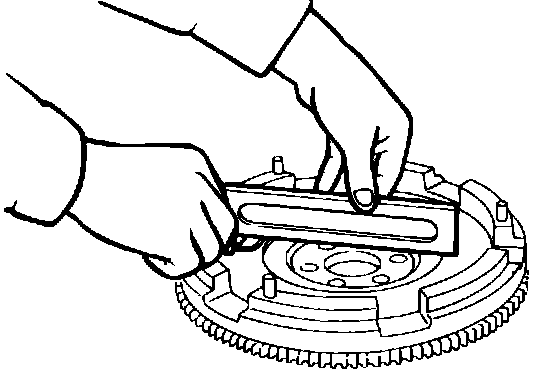 Check flywheel for wear or damage and replace if necessary. Measure flywheel warp using a suitable straightedge, Fig. 13. Warp must not exceed .008 inch (.20 mm). Inspect ring gear teeth for wear or damage and replace if necessary. To remove ring gear, heat gear with torch and tap off flywheel. Prior to installing new ring gear, heat gear to 480-570°F (250-300°C). Ensure beveled side of ring gear faces engine.