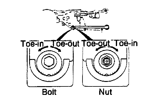 To increase the toe-in, turn the adjusting bolts as follows:
