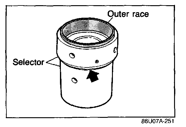 4. Set the differential assembly onto the clutch housing, then mount the bearing outer race and the selector on the differential.