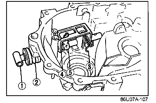 10. Install the change rod (1), the boot (2), the spring (3), the reverse gate (4), and selector (5), as shown.