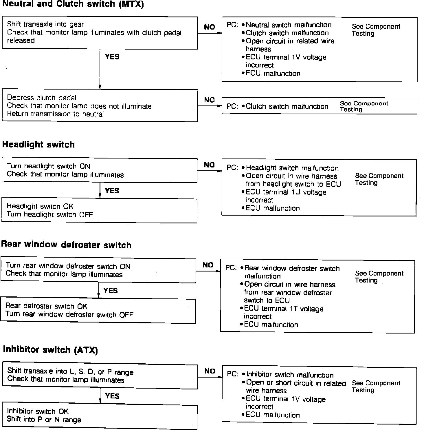 7. Check if monitor lamp illuminates when each switch is made to function as described on image chart: