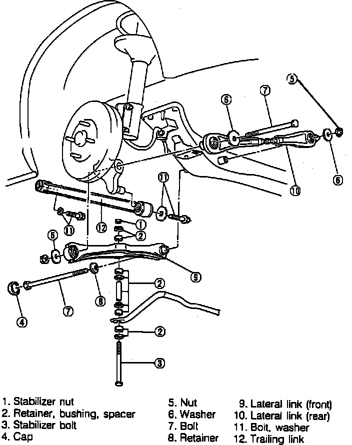 3. Install lateral link and trailing link reversing numbered sequence, Fig. 18. Tighten stabilizer nuts until .53-.59 inch on 1989 models or .64-.72 inch on 1990-92 models is exposed at end of bolt.