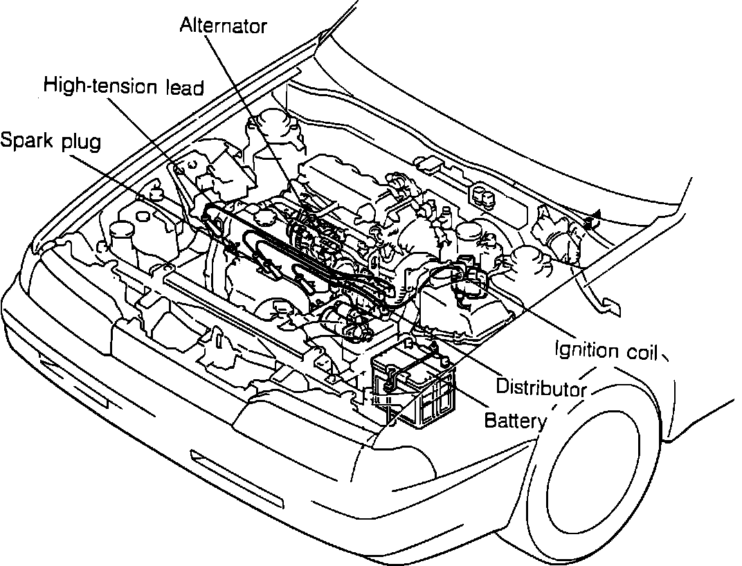 Routed between coil, distributor cap and spark plugs.
