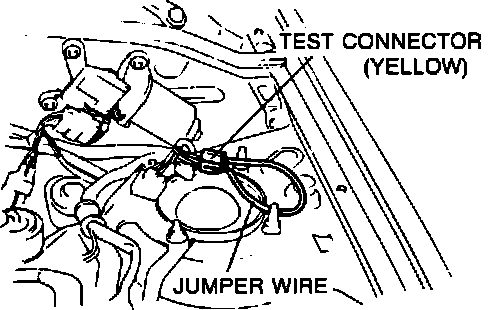 3. Energize fuel pump by bridging the terminals of the yellow fuel pump test connector (located near the firewall below the windshield wiper motor, see illustration) and turning ignition "ON" .
