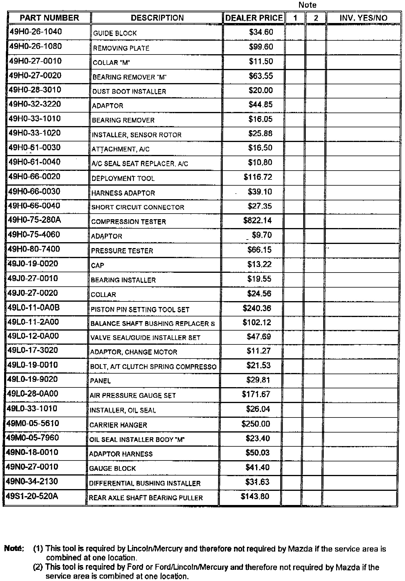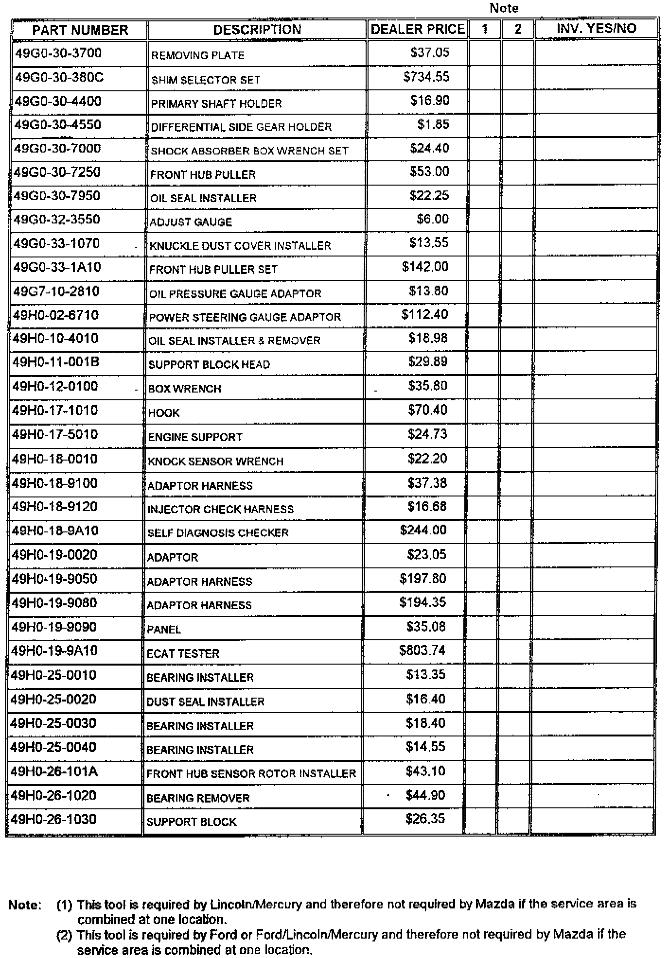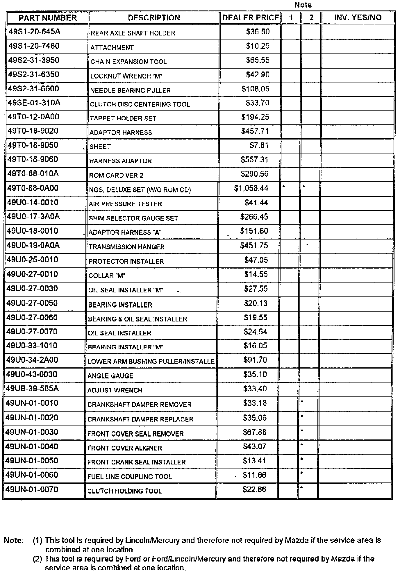 Updates will not include price changes. Prices are subject to change without notice. Use the toll free telephone numbers listed below ORDERING TOOLS" to contact America Kowa Seiki, Inc., Mazda's tool vendor, for current pricing.
