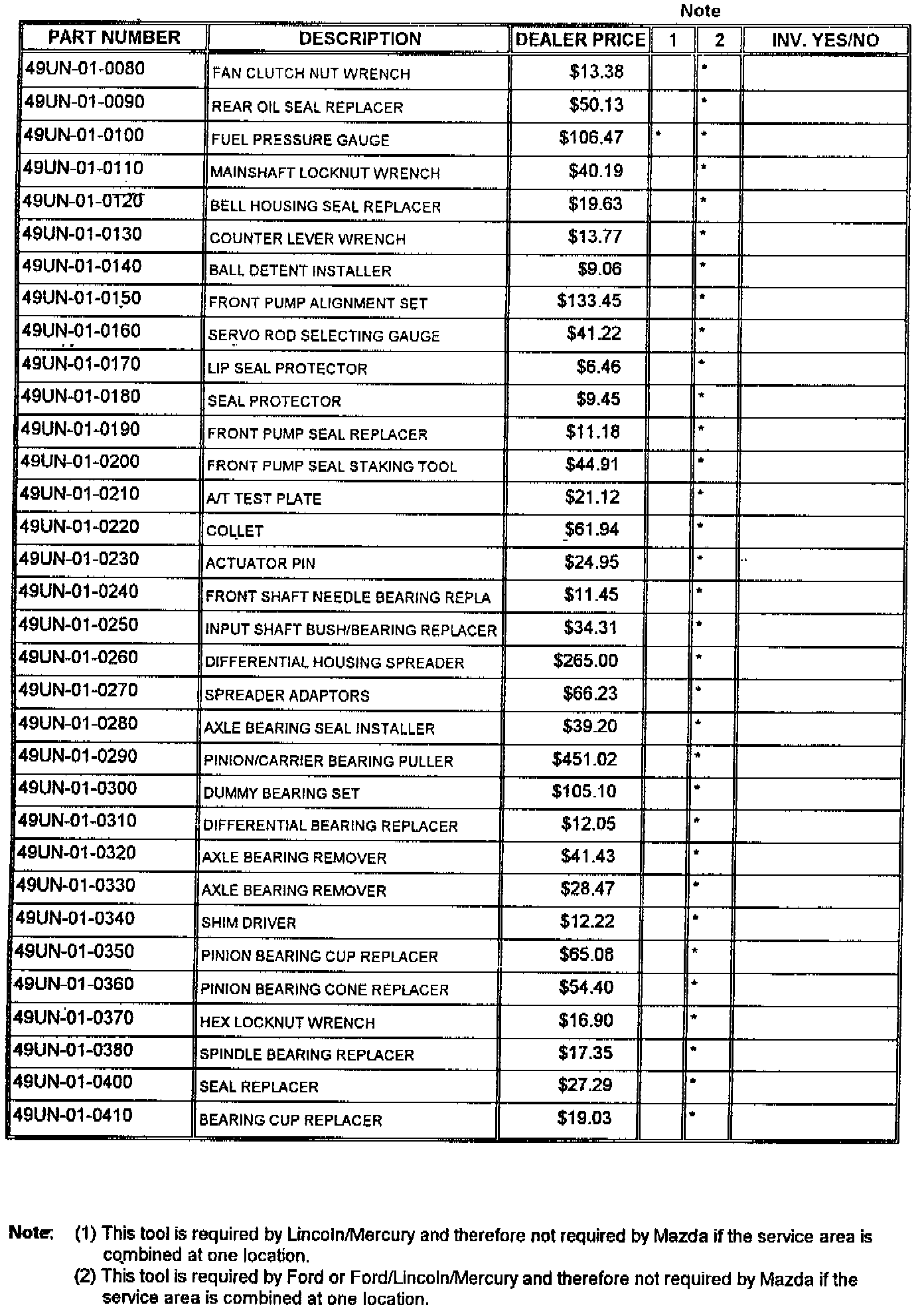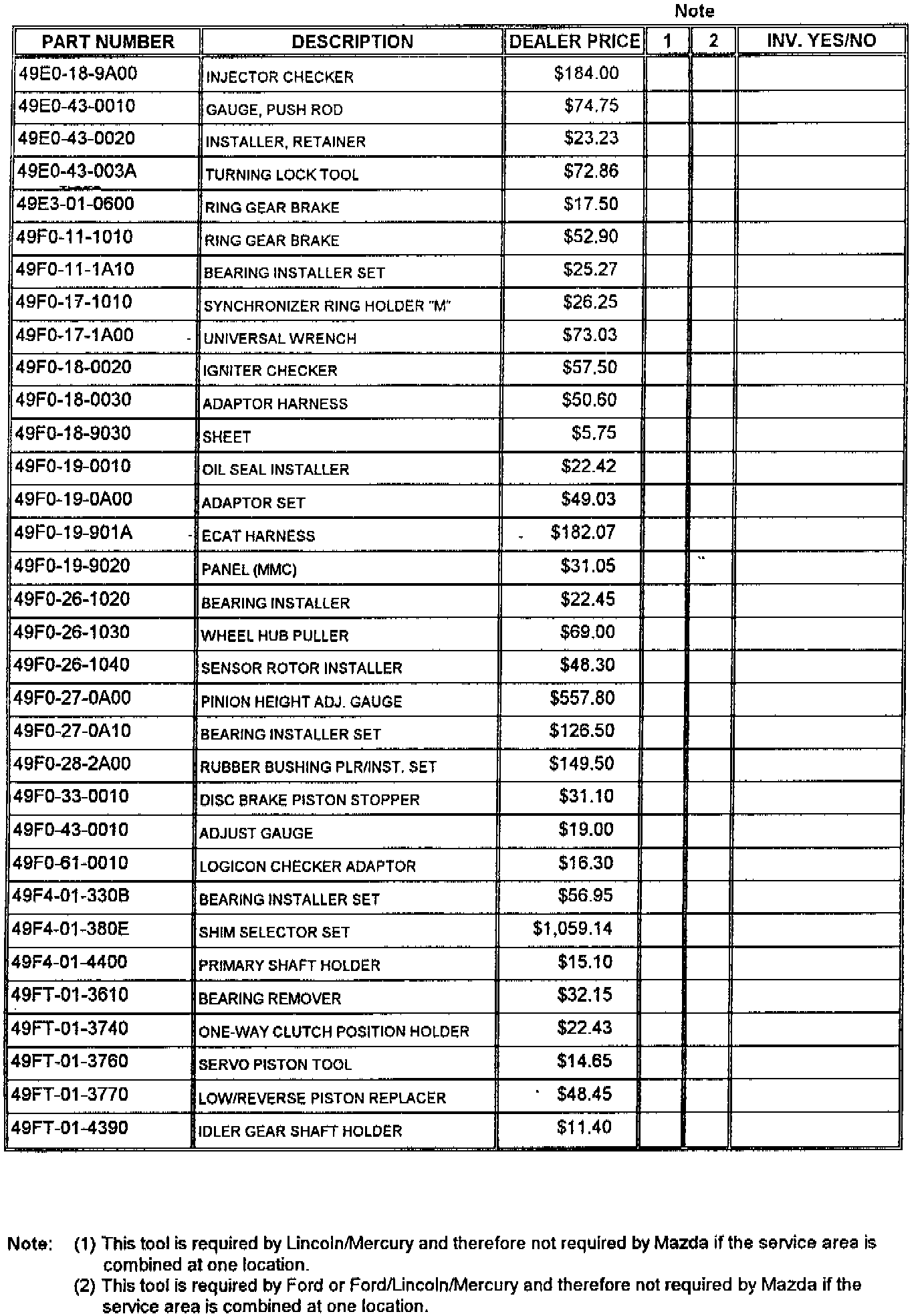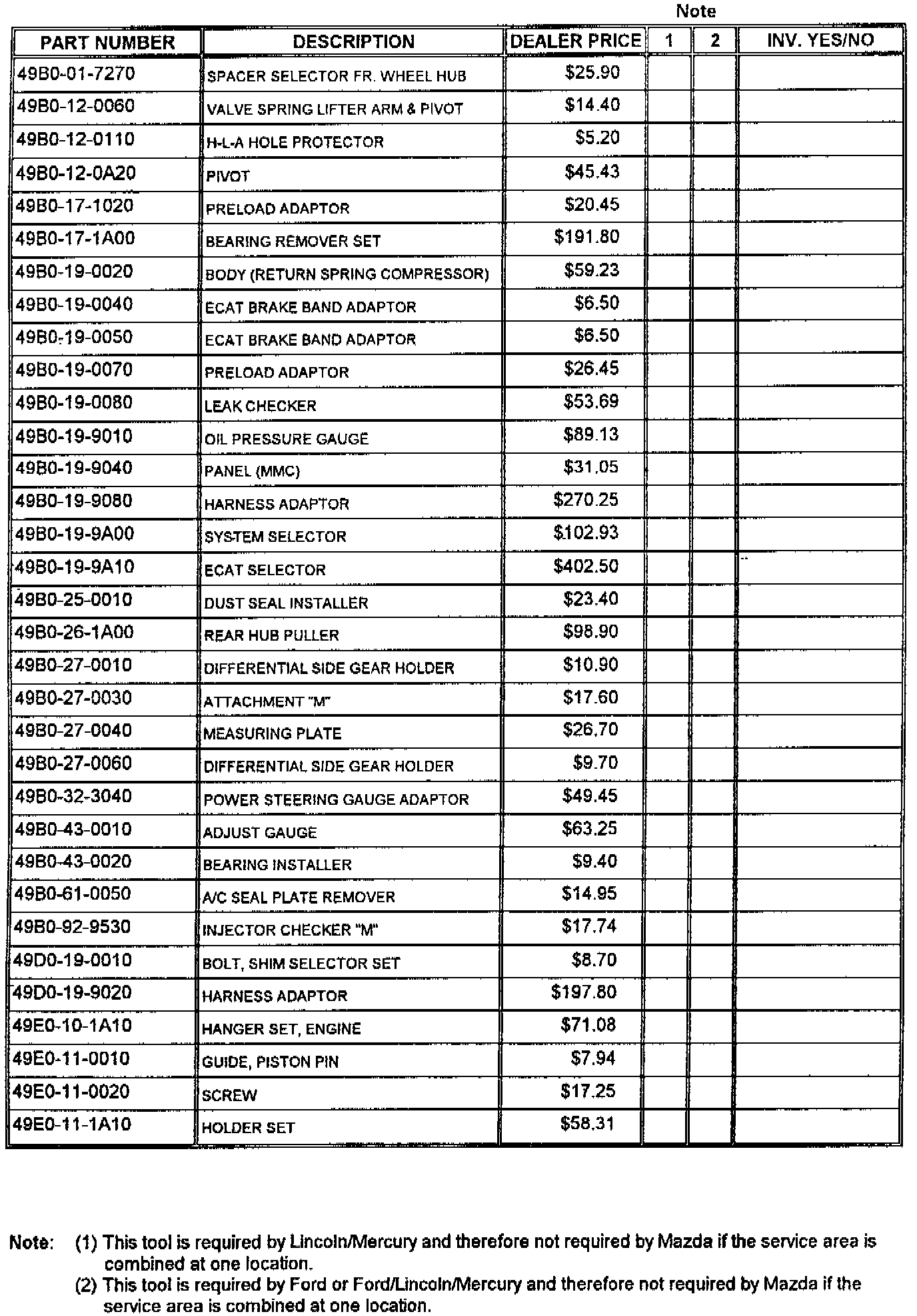 Updates will not include price changes. Prices are subject to change without notice. Use the toll free telephone numbers listed below ORDERING TOOLS" to contact America Kowa Seiki, Inc., Mazda's tool vendor, for current pricing.