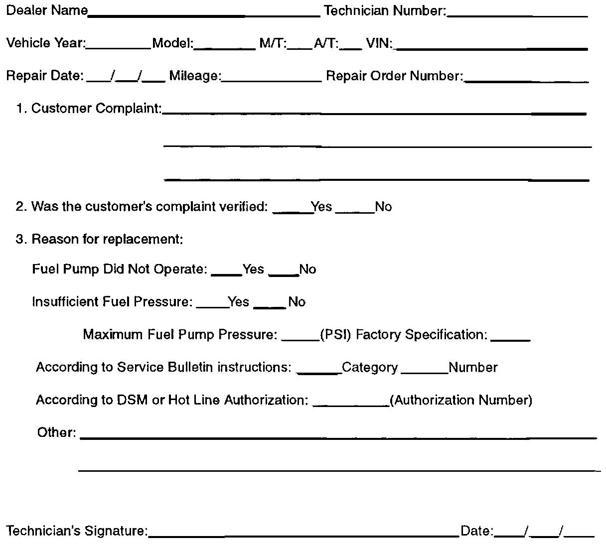 Attach the check sheet to the repair order. If requested to return the failed fuel pump to Mazda, attach a copy of the check sheet and repair order.
