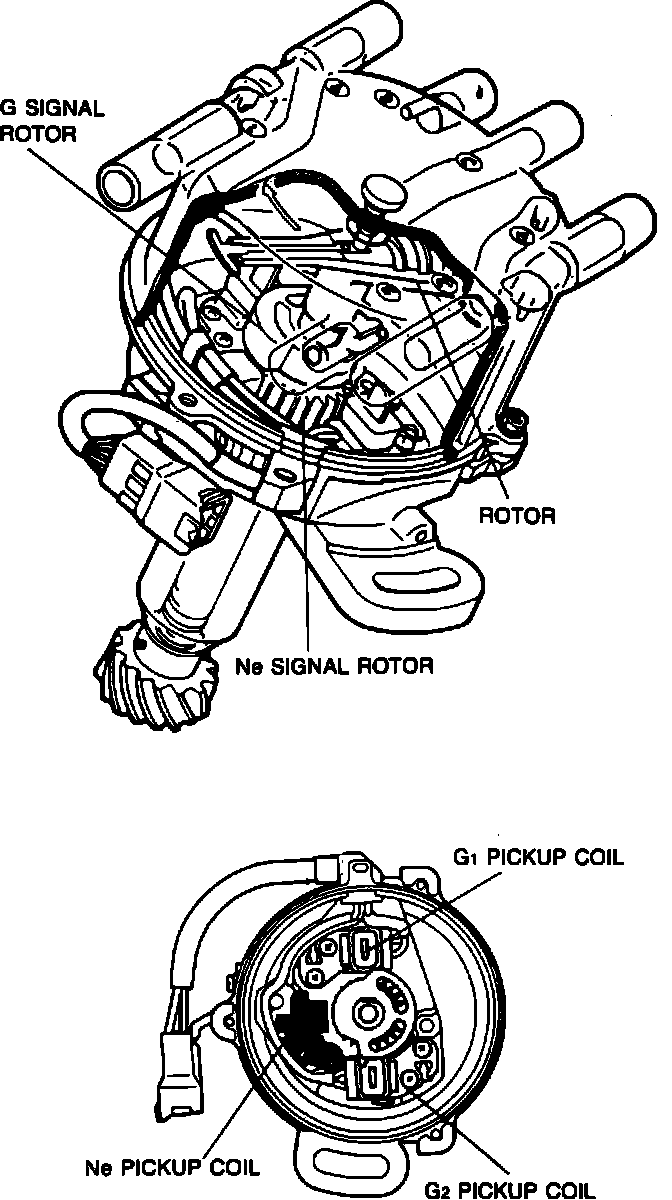 The crank angle sensor generates two signals utilized by the ECU in its calculations for ignition timing and other outputs. The sensor is a magnetic pick-up type with reluctor (signal rotor) turned by the distributor shaft. The "Ne" signal detects crank angle at 30° intervals and is utilized by the ECU to determine engine rpm. The "G1" and "G2" signals detect #1 and #4 cylinders TDC and are utilized by the ECU to determine fuel injection and ignition timing. Spark advance is controlled by the ECU without centrifugal or vacuum advance mechanisms.