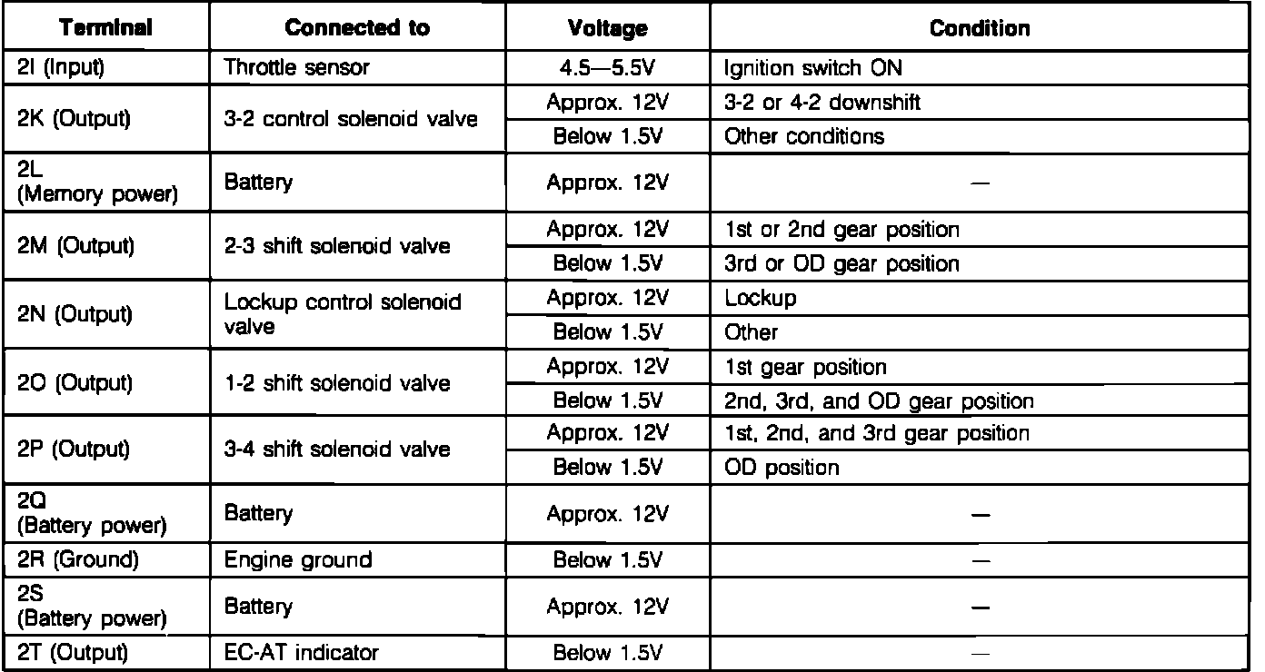 1. With ignition switch "ON," check EC-AT control unit terminal voltages, referring to terminal voltage chart.