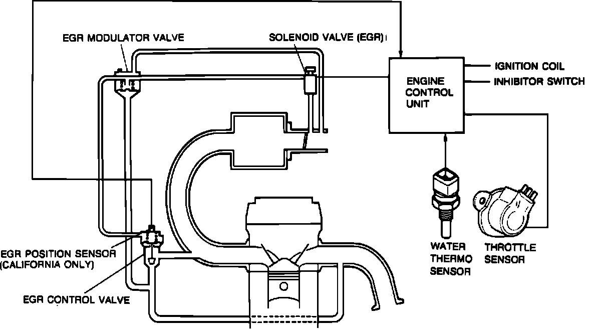 The EGR system introduces exhaust gases into the intake manifold to reduce the production of NOx. It operates depending on the engine load, engine speed (above 1,500 RPM), engine coolant temperature above 70°C (158°F). The EGR system consists of the following components: EGR control valve, EGR modulator valve, engine control unit, ignition coil, EGR solenoid valve, throttle sensor, engine coolant temperature sensor, and radiator coolant temperature sensor.