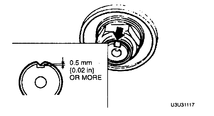 2. If the bearing inner race remains on the front wheel hub component, grind a section of the bearing inner race until approximately 0.5 mm (0.02 inch) remains. Then remove it by using a chisel.