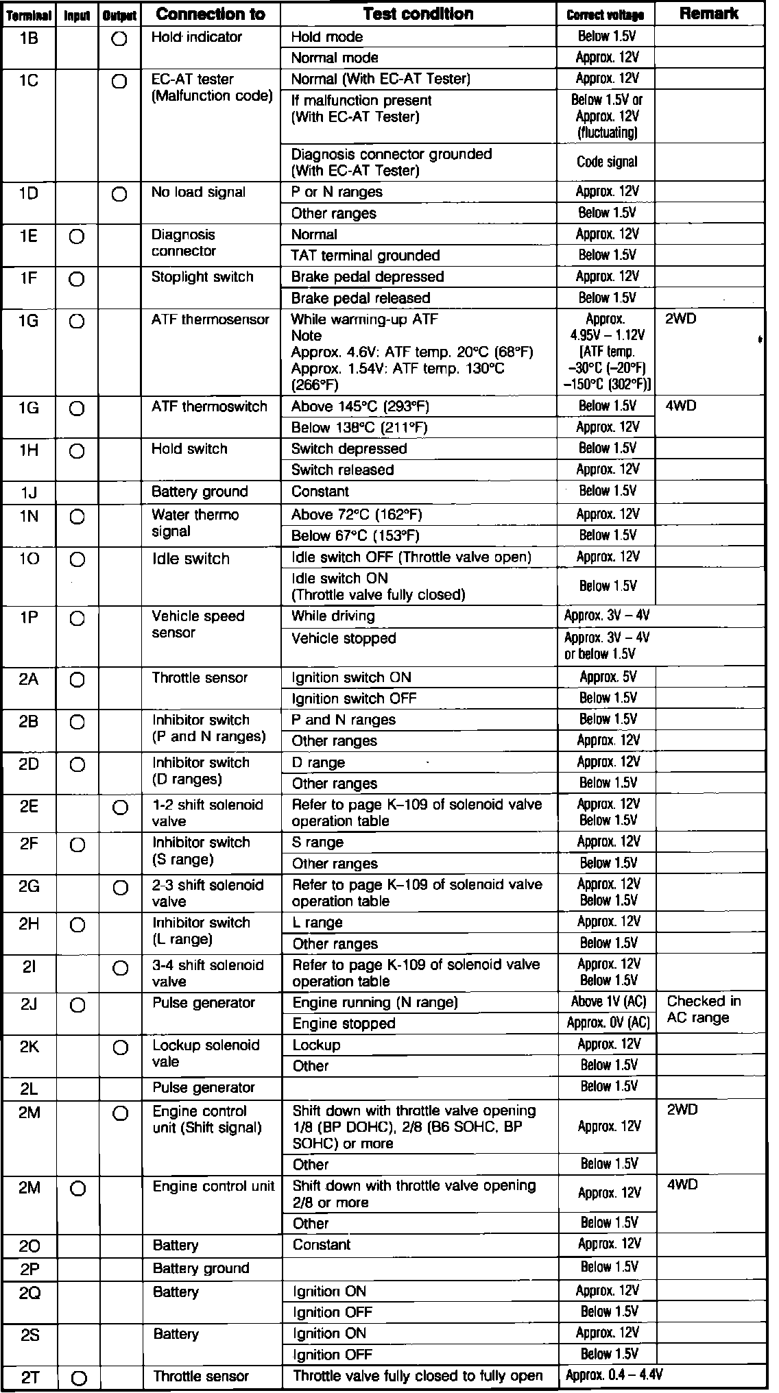 EC-AT Control System. ECU Pin Voltage Chart: