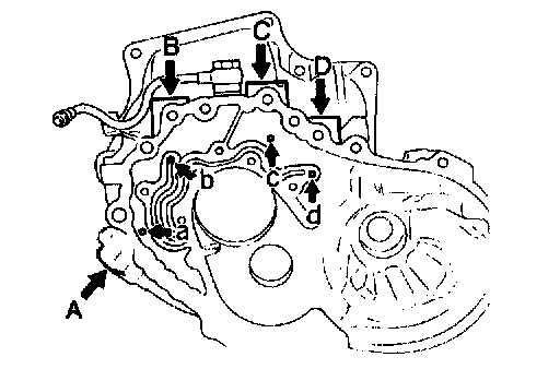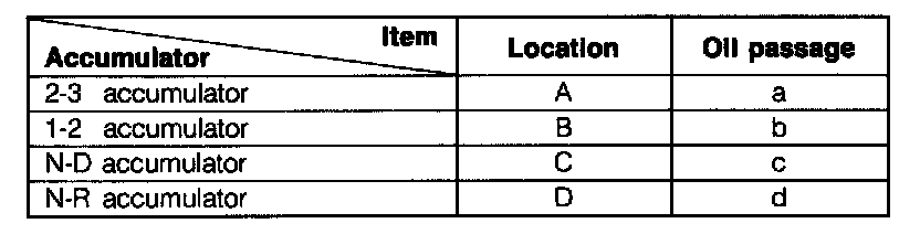 Remove the accumulator pistons and springs from the clutch housing by applying compressed air through the oil passage as shown in the figure.