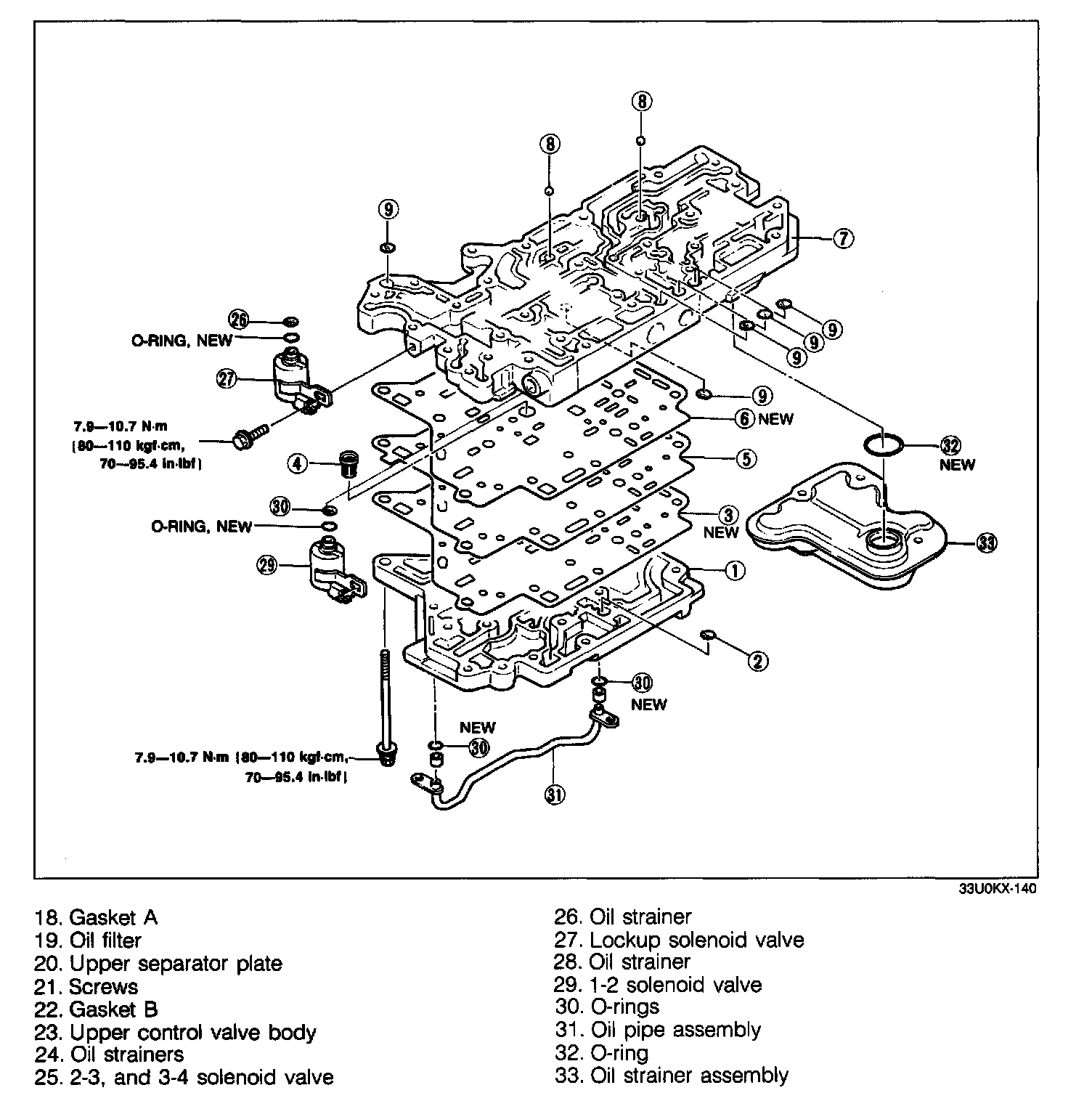 20. Install the 1-2 solenoid valve and oil strainer onto the upper valve body.