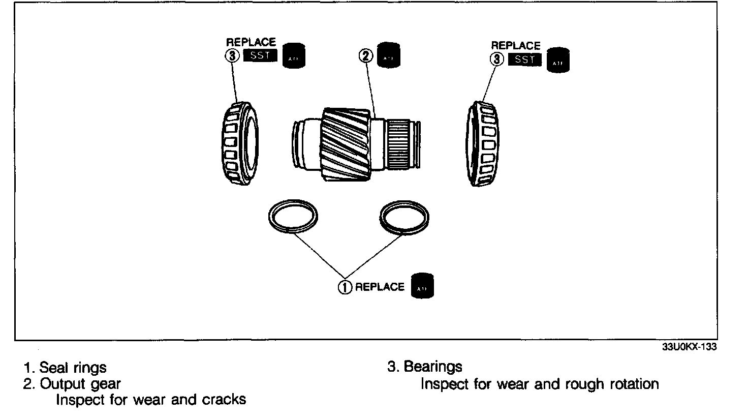 Apply ATF to new seal rings and install them to each side of the output gear.