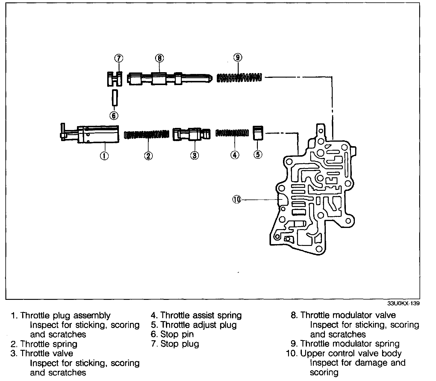 1. Insert the throttle modulator spring, throttle modulator valve, and stop plug, then secure them with the stop pin.