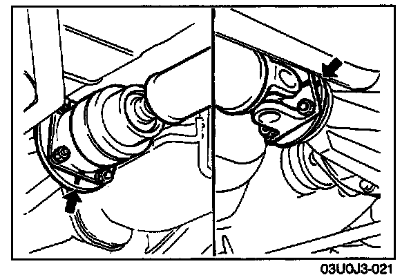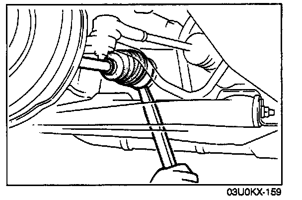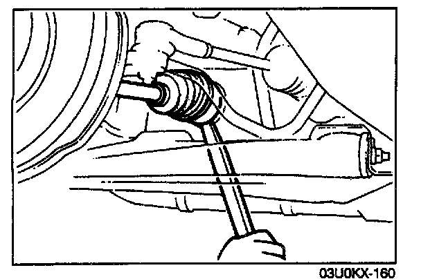 3. Separate the left driveshaft from the transaxle by prying with a bar inserted between the shaft and the transaxle case.