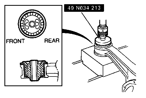 1. Press in the new differential mounting rubber, with the voids facing fore and aft, with SST #49 N034 213 or equivalent. Press to 19600N (4400 lbf).