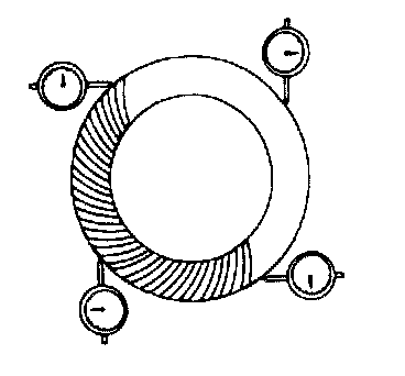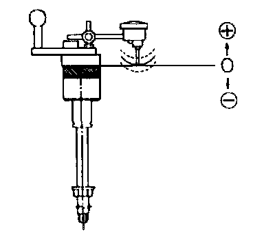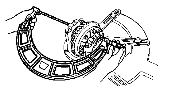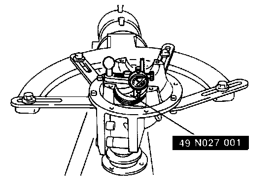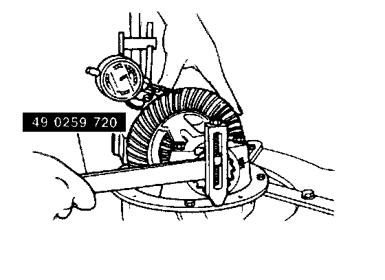 37. Mark the ring gear at four points at approx. 90° intervals. Mount a dial indicator to the carrier so that the feeler comes in contact at a right angle with one of the ring gear teeth.