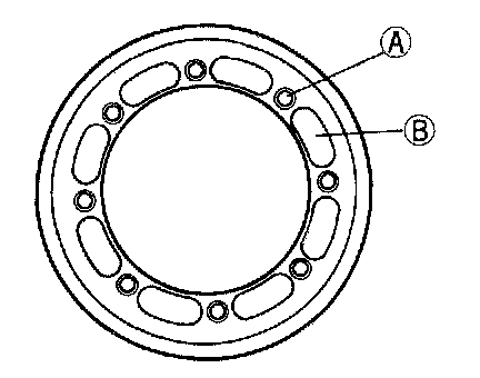 32. Apply thread-locking compound (approx. 0.04cc (0.0024 cu in.) at each point) to the bolt threads (A) and point (B) of the gear back face.