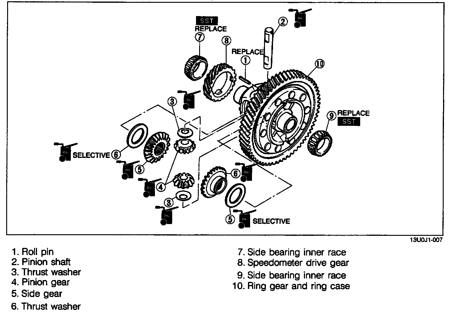 4. If the backlash exceed specification, adjust by selecting and installing thrust washers between the case and the side gears.