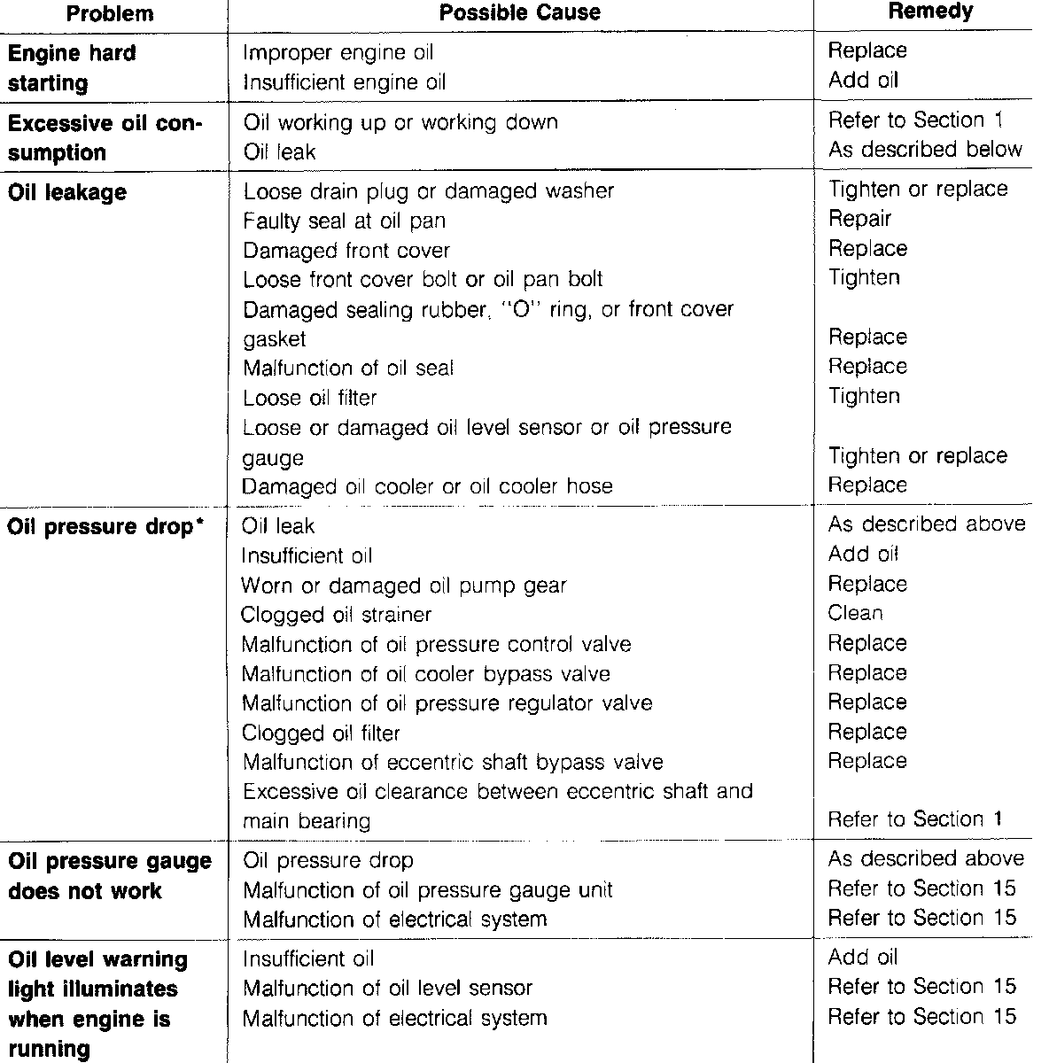 6. Oil pressure drop. Oil pressure becomes low when the engine is cold because the eccentric shaft bypass valve operates.