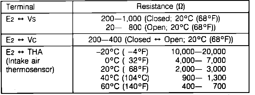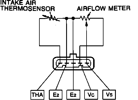 Airflow meter input voltage can be checked at ECU terminal 2B. With ignition "ON" (engine not running), voltage should be approximately 4.0V. At idle, voltage should be 2.5 - 3.5V.