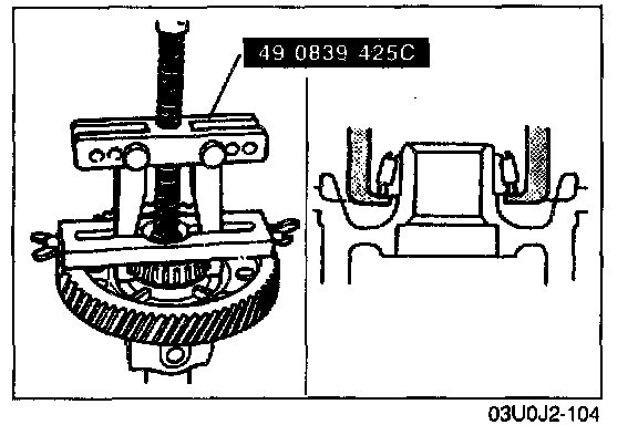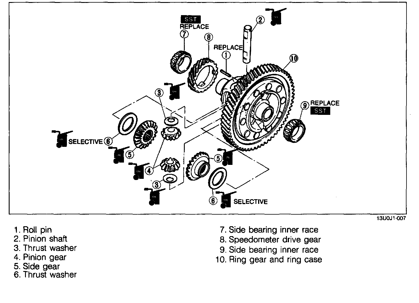 4. It the backlash exceeds specification, adjust by selecting and installing thrust washers between the case and the side gears.