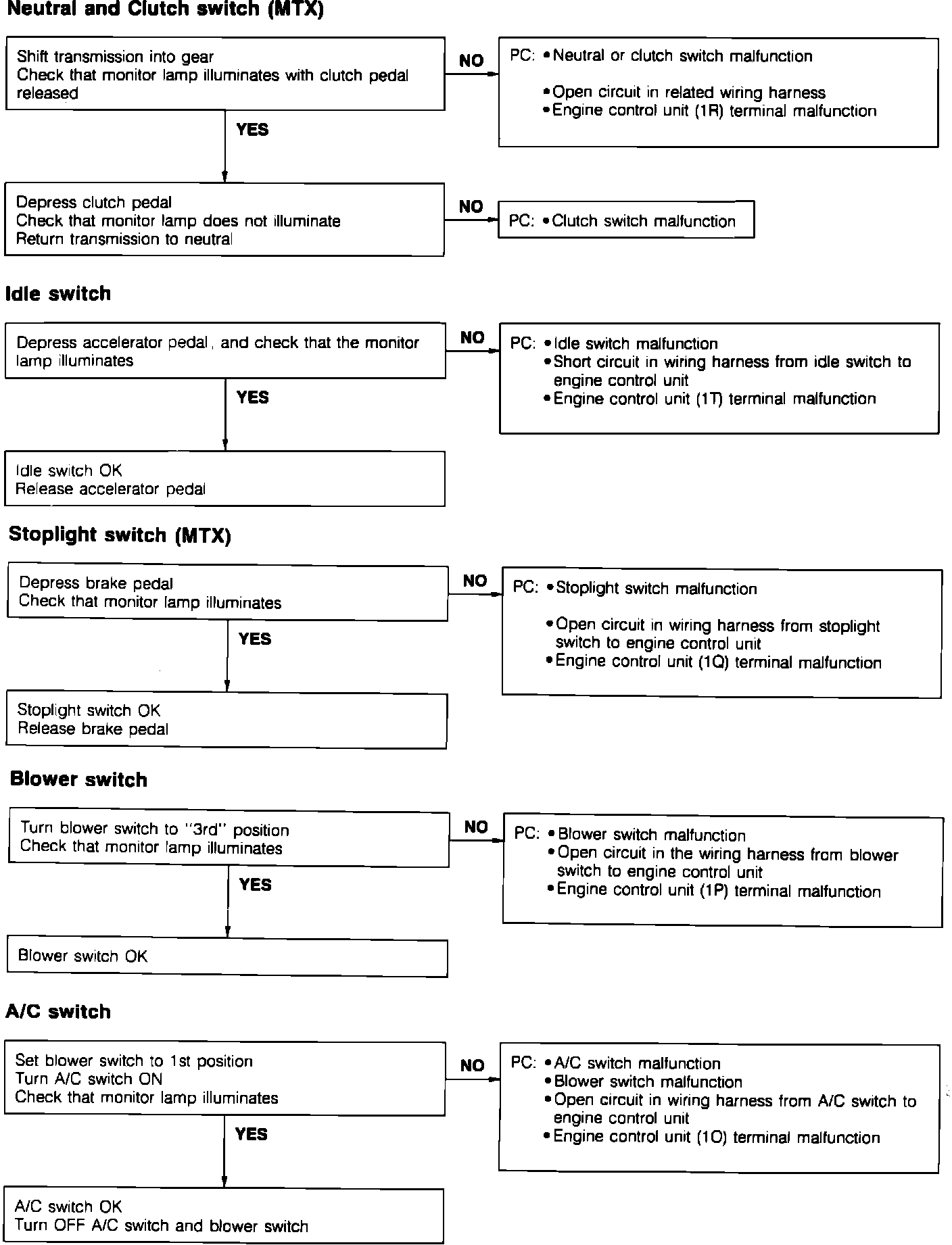 4. Turn ignition switch "ON." Check if monitor lamp illuminates when each switch is made to function as described on image chart: