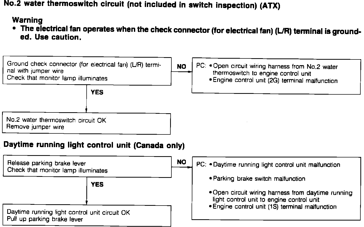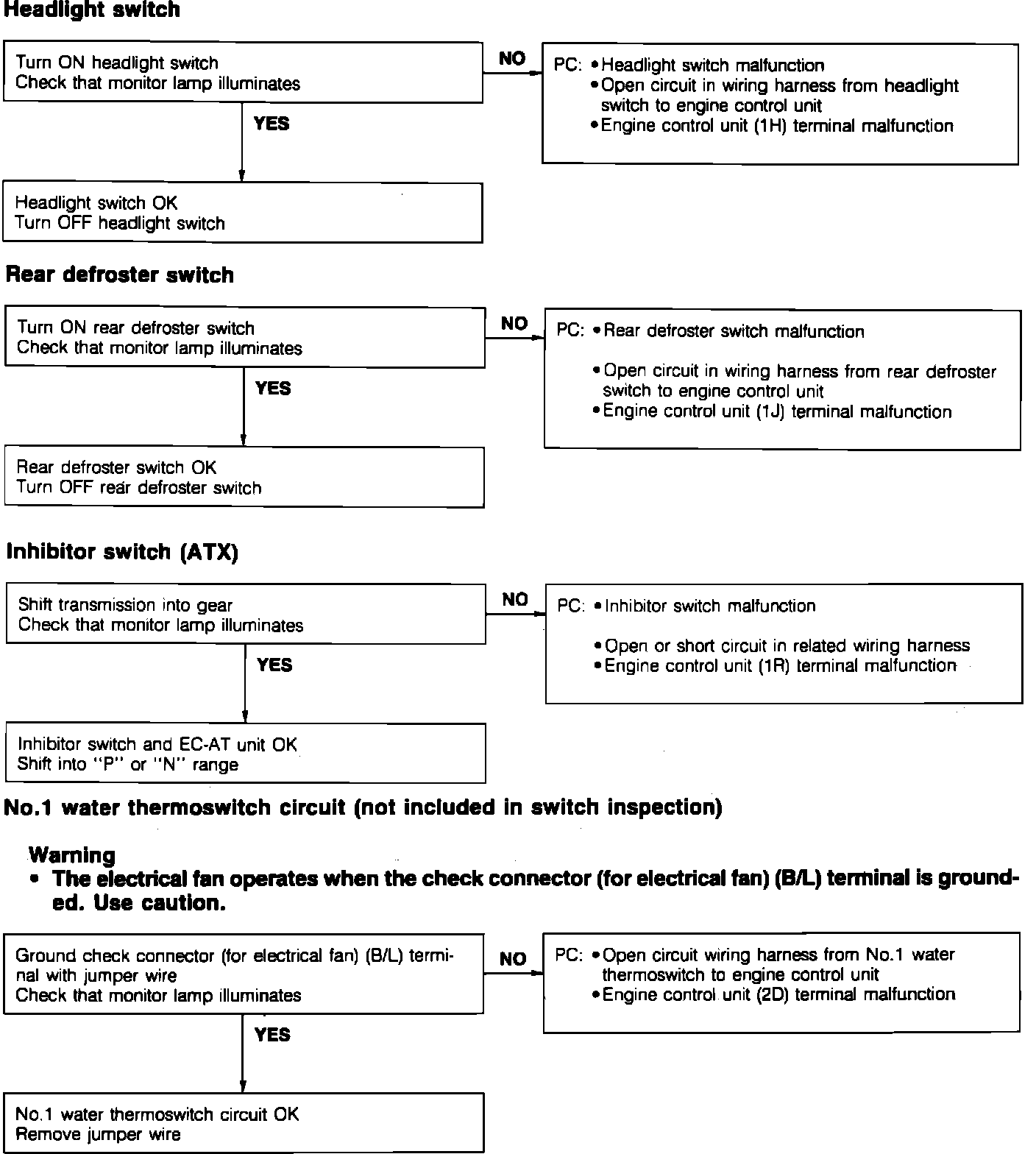 If malfunctions are detected, check individual switches with these charts and refer to COMPONENT TESTING if required: