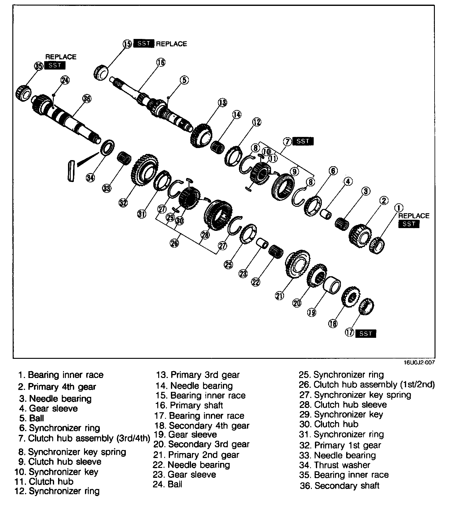 Remove the clutch hub assembly (1st/2nd) and 1st gear.