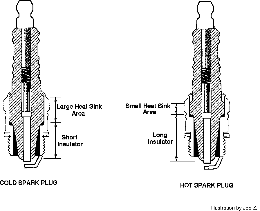 ^ Cold plugs have shorter insulators around the center electrode and a larger cross-sectional area for heat to transfer to the cylinder head. Heat is conducted away from the center electrode quickly and the electrode remains at a cooler operating temperature.