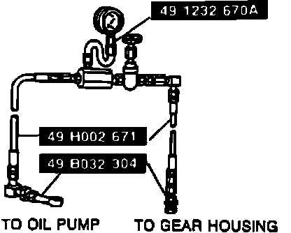 4. Close tool valve, increase engine speed to 1000-1500 RPM and measure oil pump fluid pressure. Open valve. Do not allow valve on tool to remain closed for more than 15 seconds or pump damage will result.